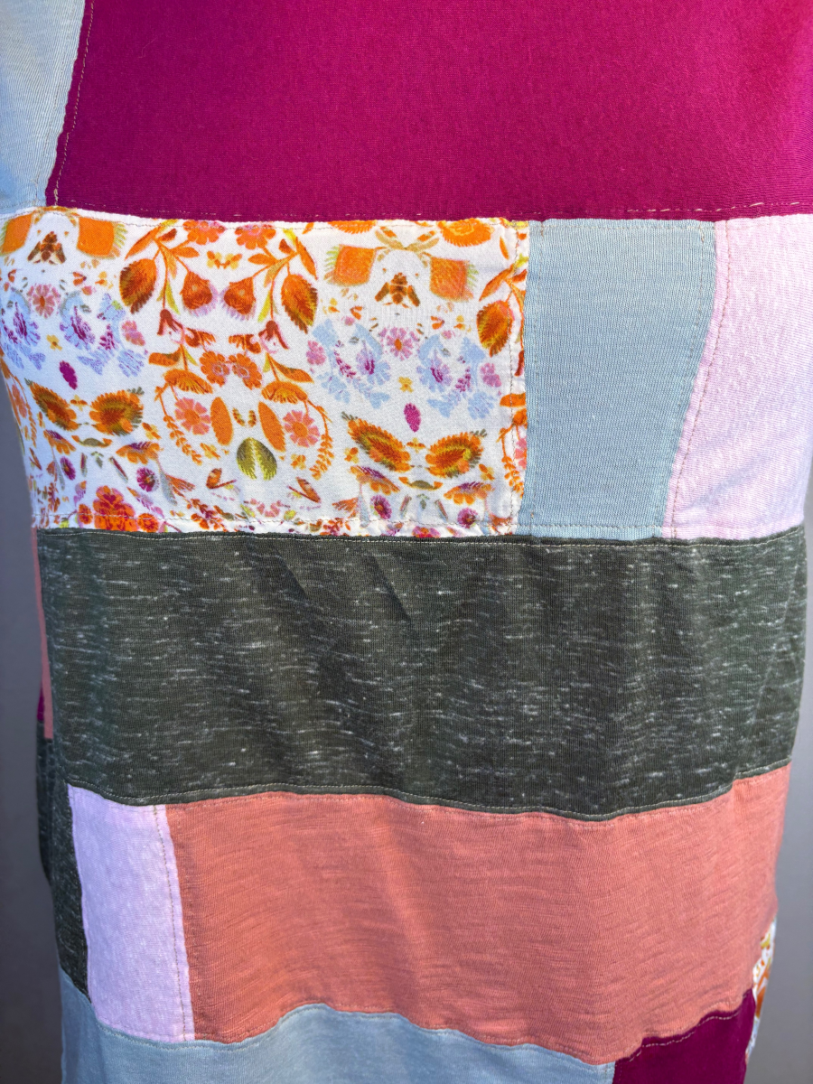 This one-of-a-kind upcycled patchwork blouse is a light airy breath of fresh air. You'll love the whimsical colors that beg bring on spring. It's comfy and stretchy while being form fitting and flattering at the same time. Wear it with a jacket and jeans or a skirt and flats, it's totally versatile.